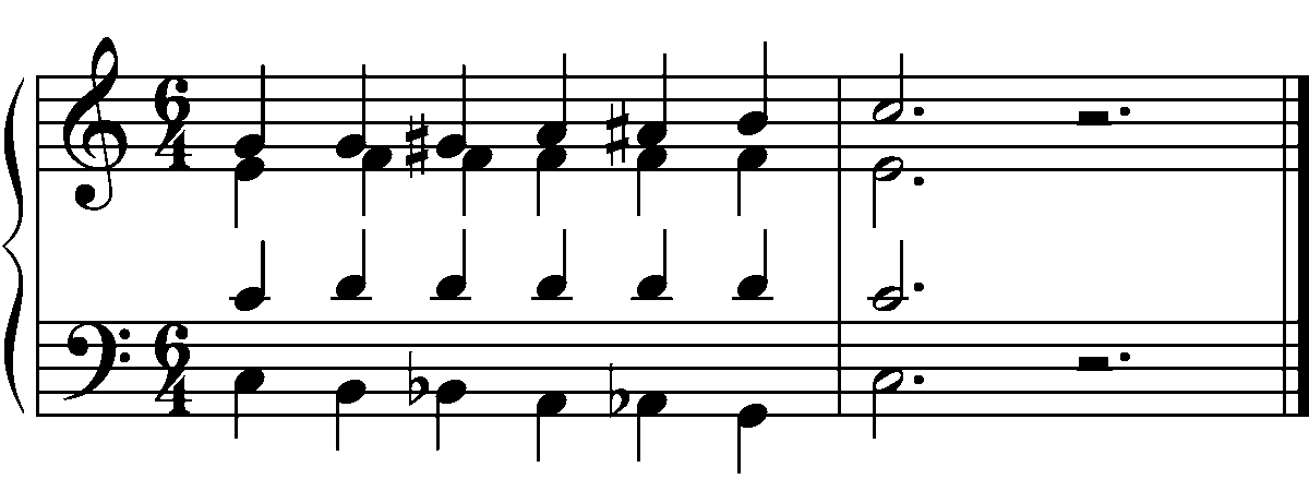The bass voice descends by half steps while the soprano voice gradually climbs by half steps. On the last beat of the first measure, a G7 chord results, and the composer opts to use it to bring the phrase back to tonic.