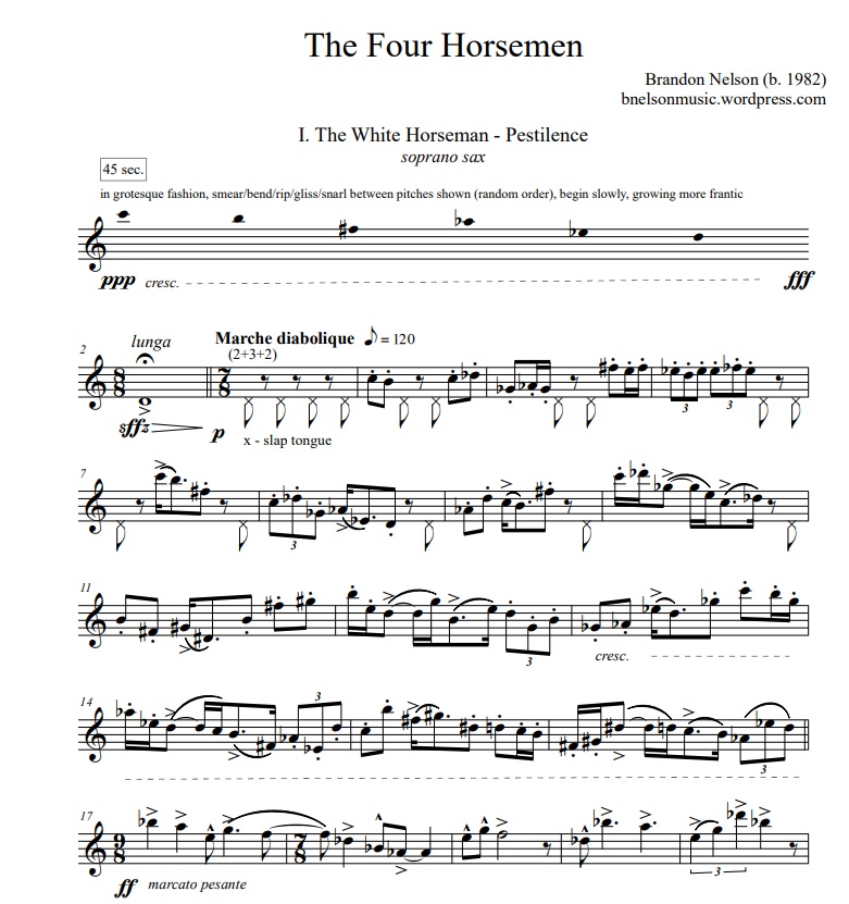 chose the theme of the “four horsemen of the apocalypse” because, as he puts it, “the saxophone was long