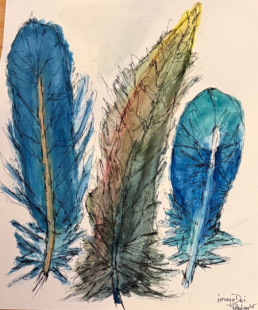 In this installment of the “Feather” series (and, in a surprise to me, one of my most popular pieces), I decided on three feathers to add a sense of “composition” to the piece–utilizing space and contrast as expressive means in themselves.
