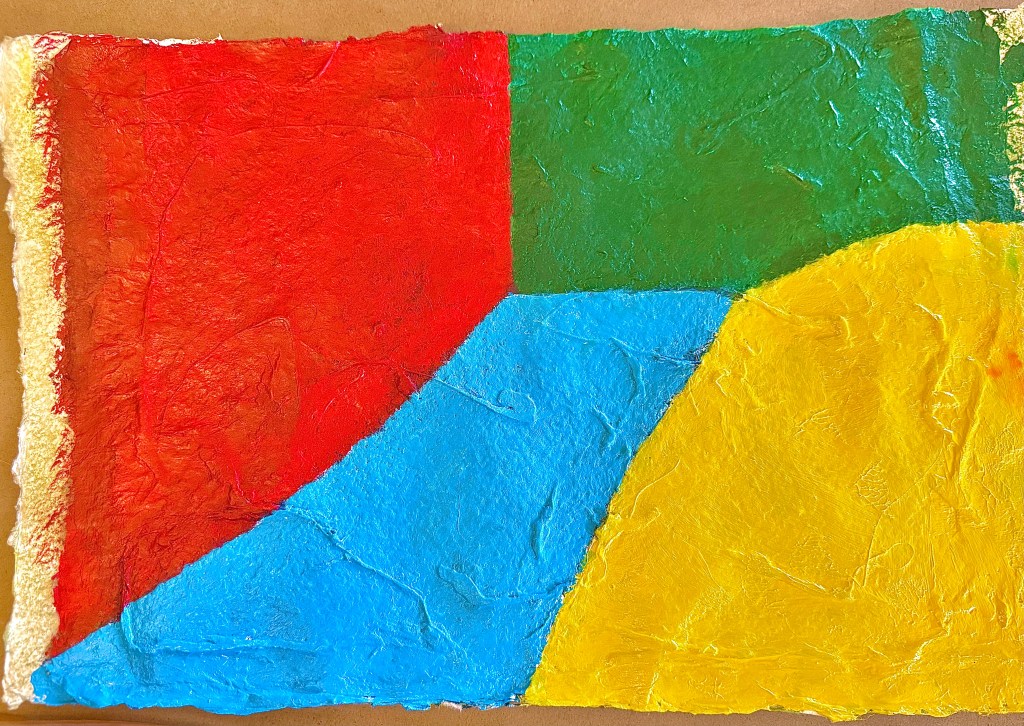 I purposely chose highly contrasting colors, and represented in their stronger hues, but I placed them adjacent to each other rather than in any way blended or mingled. I boldly state these colors, in the form of simple shapes, to catch the eye and to highlight the unique textures that I knew would result when I chose to create this piece on mulberry pulp paper backed by a rough, thick, handmade cotton sheet. In short, this composition brings out a variety of unusual textures energized by loud, insistent colors. The edges are left frayed, both on the paper and in the colored shapes, on purpose.