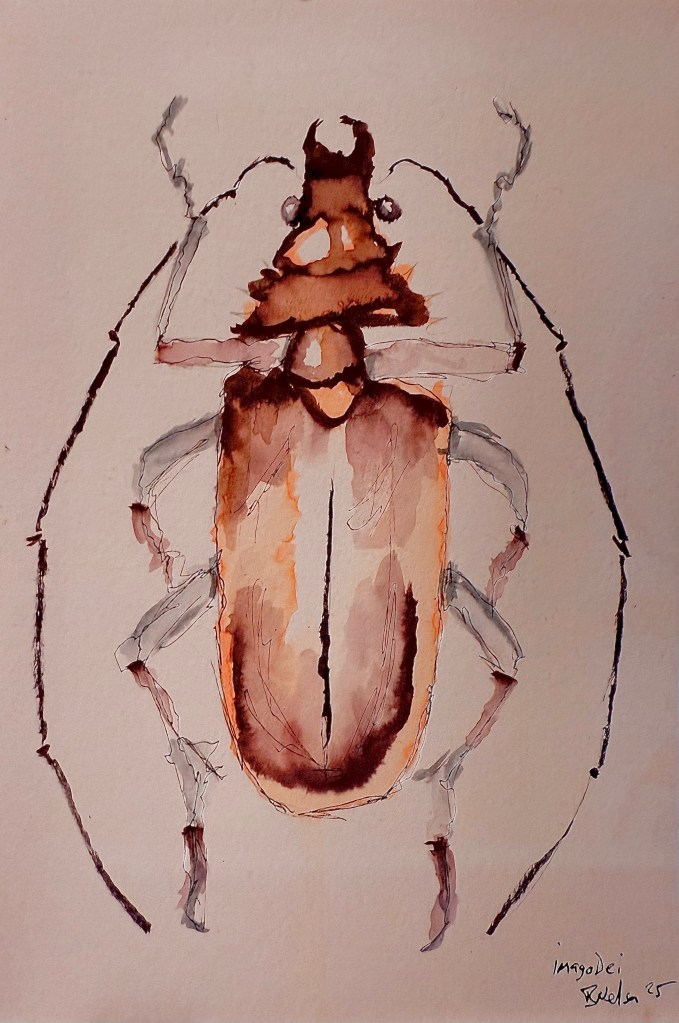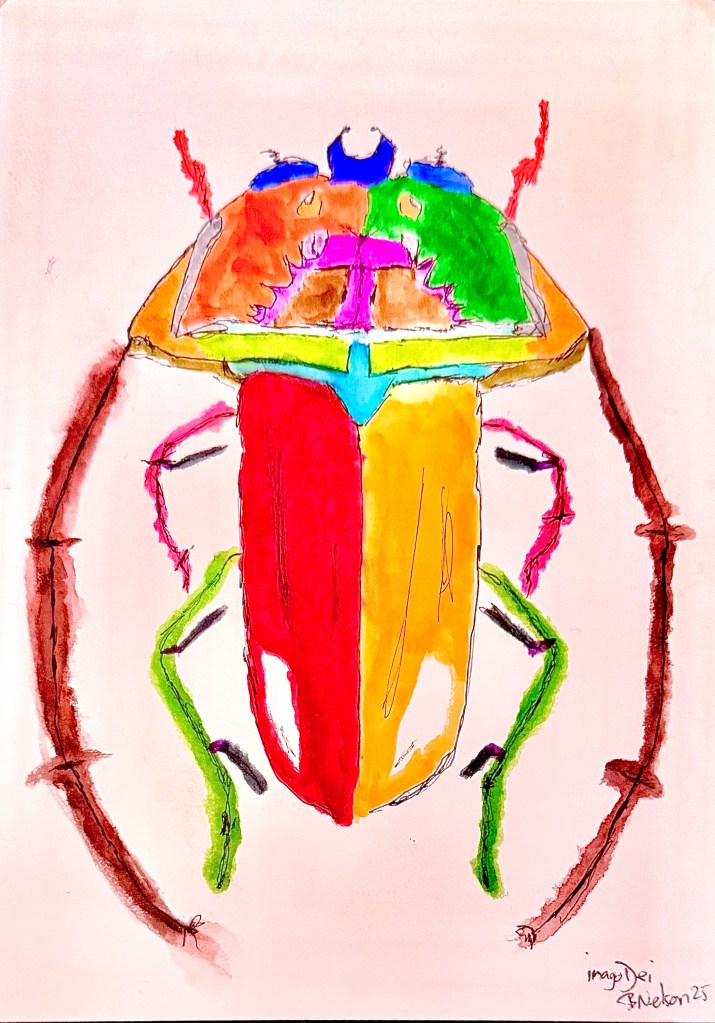 I will admit I don’t actually much care for beetles. I don’t wish them any specific harm, I just don’t feel like interacting with them. But they are rather interesting looking creatures, as I tried to capture in this piece.